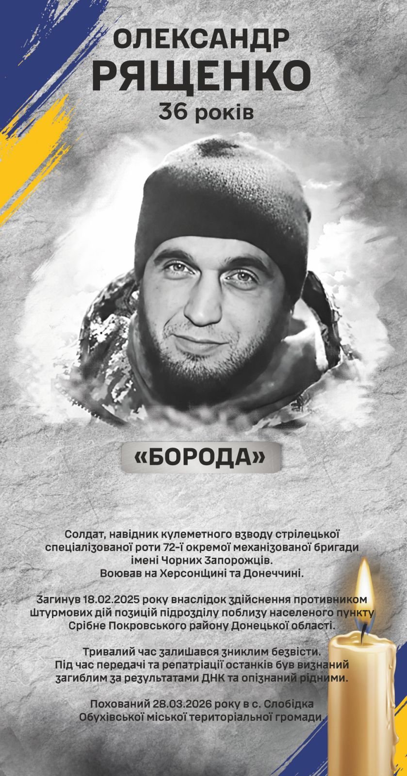 Висловлюємо щирі співчуття батькові Івану Петровичу, сестрам Тетяні, Олені, Катерині, дідусю Петру Корнійовичу, бабусі Варварі Миколаївні, усім рідним, близьким та побратимам.
