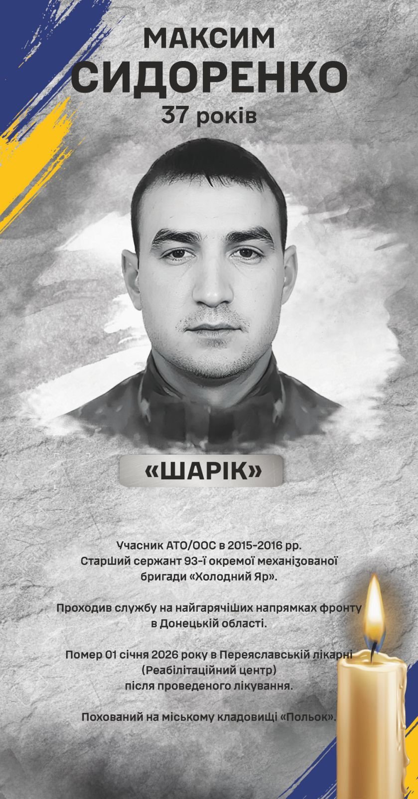 На жаль, 1 січня 2026 року життя Сидоренка Максима Петровича обірвалося. Він помер у лікарні.