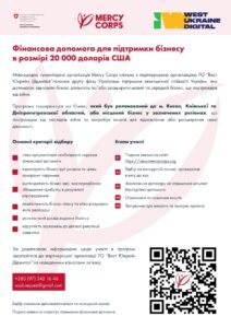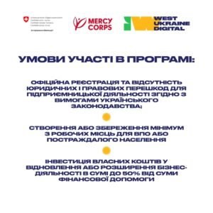 Міжнародна гуманітарна організація Mercy Corps спільно з партнерською організацією ГО «Вест Юкрейн Діджитал» розпочала другу фазу конкурсної Програми підтримки економічної стійкості України, яка допомагає відновити бізнес-діяльність та/або розширити малий та середній бізнес, що постраждав від війни.