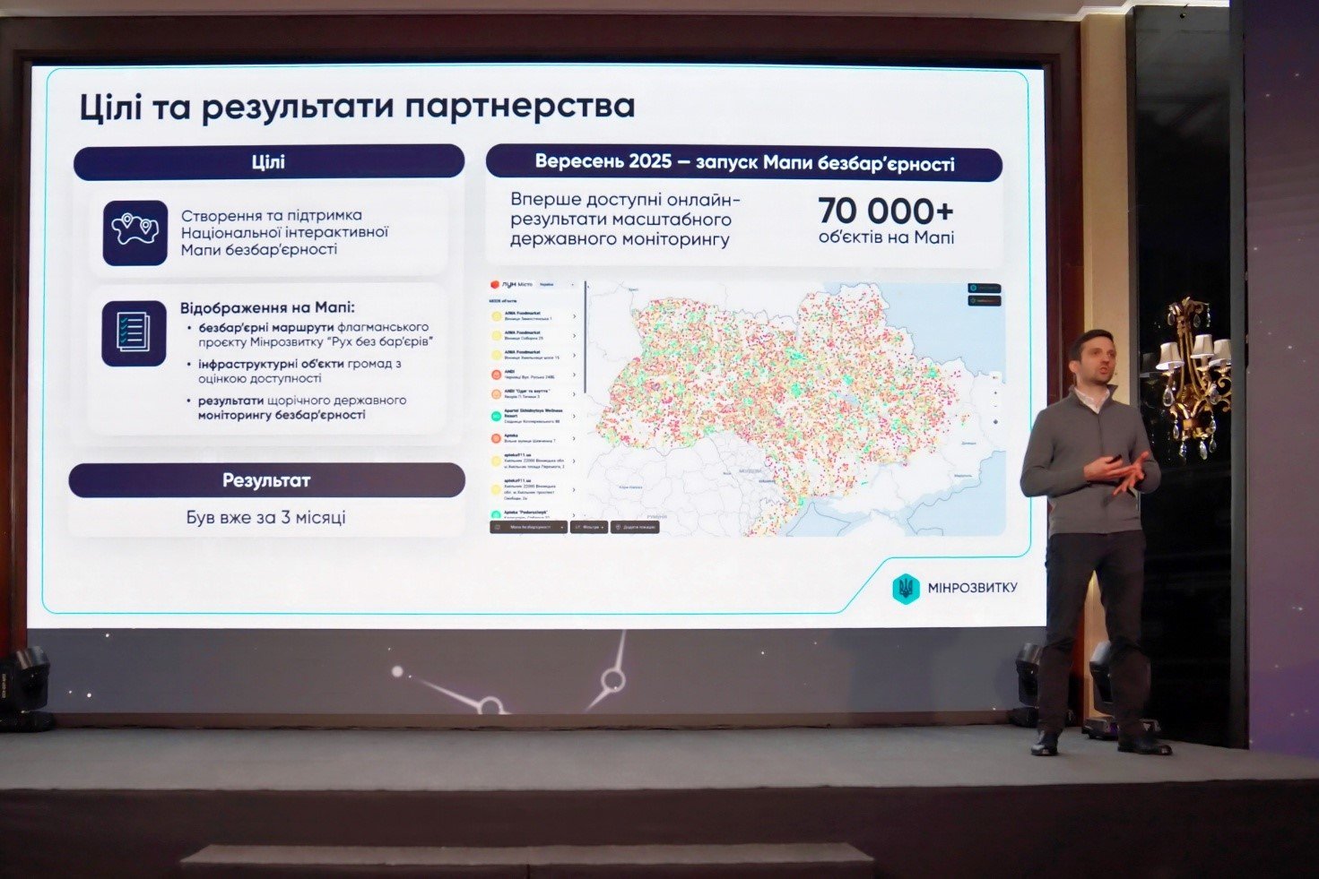 Заступник Міністра розвитку громад та територій України з питань цифрового розвитку, цифрових трансформацій і цифровізації Андрій Братусь взяв участь у щорічній конференції «Небайдужі. Міжсекторні партнерства в Україні». Подія об’єднала представників держави, бізнесу та громадського сектору, щоб спільно напрацювати практичні рішення та формувати партнерства, які здатні впливати на розвиток країни вже сьогодні. У межах окремої панелі, присвяченої взаємодії держави та бізнесу, Міністерство розвитку громад та територій разом із технологічним партнером громадською організацією “ЛУН Місто”, представили перші результати співпраці над створенням національної Мапи безбар’єрності. З