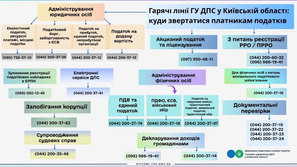 Головне управління ДПС у Київській області забезпечує постійний консультаційний супровід платників податків через мережу спеціалізованих гарячих ліній. Це дозволяє оперативно отримати роз’яснення з податкових питань, електронних сервісів, перевірок, адміністрування податків і зборів, а також вирішити проблемні ситуації без зайвих візитів до податкових органів.