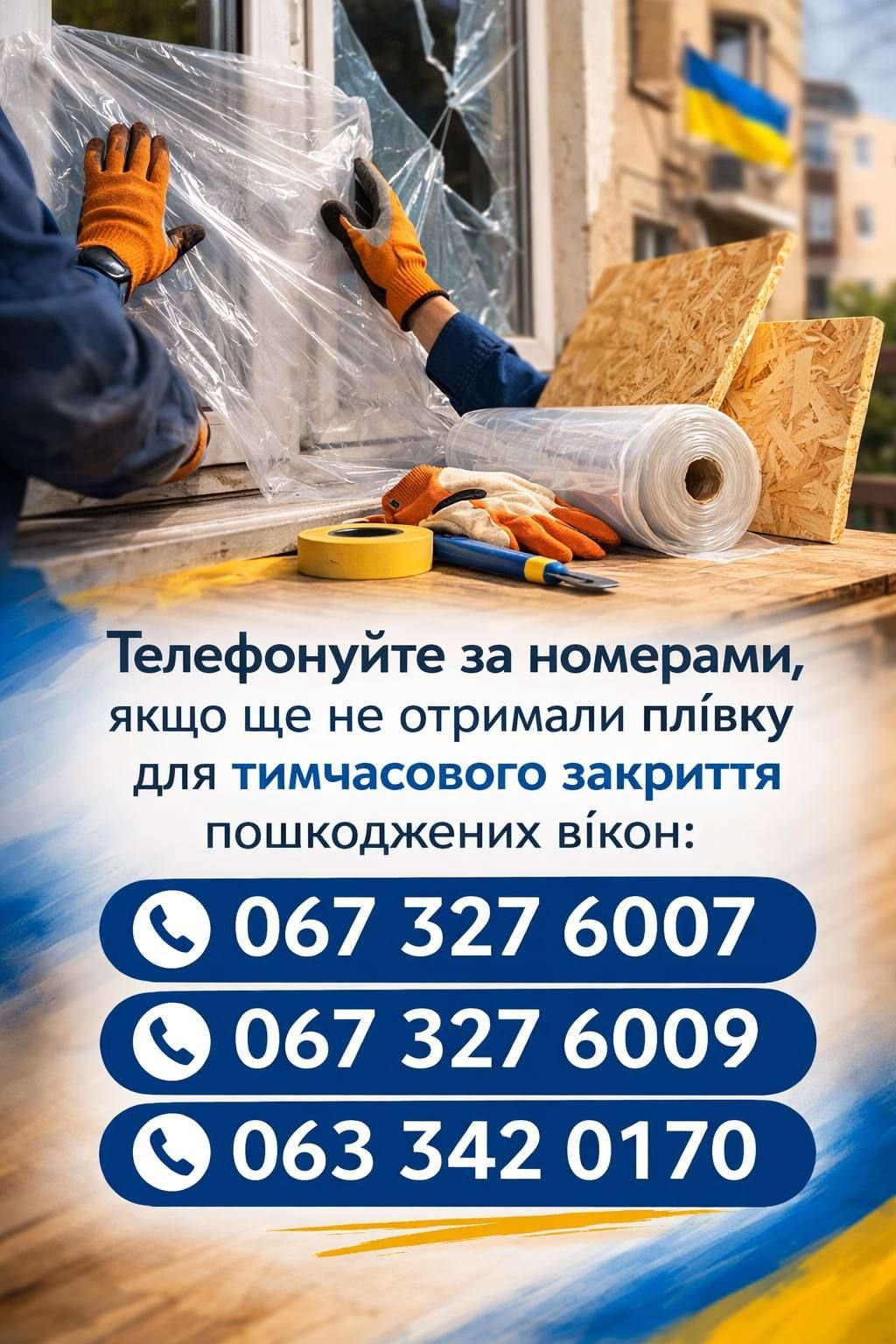 Якщо ви ще не отримали плівку або плити ОСБ для тимчасового укриття пошкоджених вікон, просимо повідомити про свою потребу, зателефонувавши за відповідними номерами.