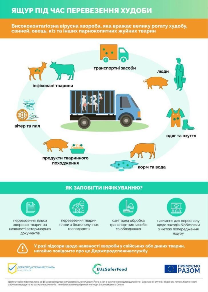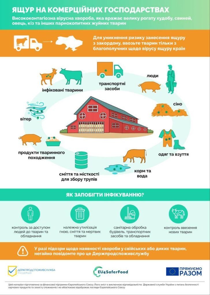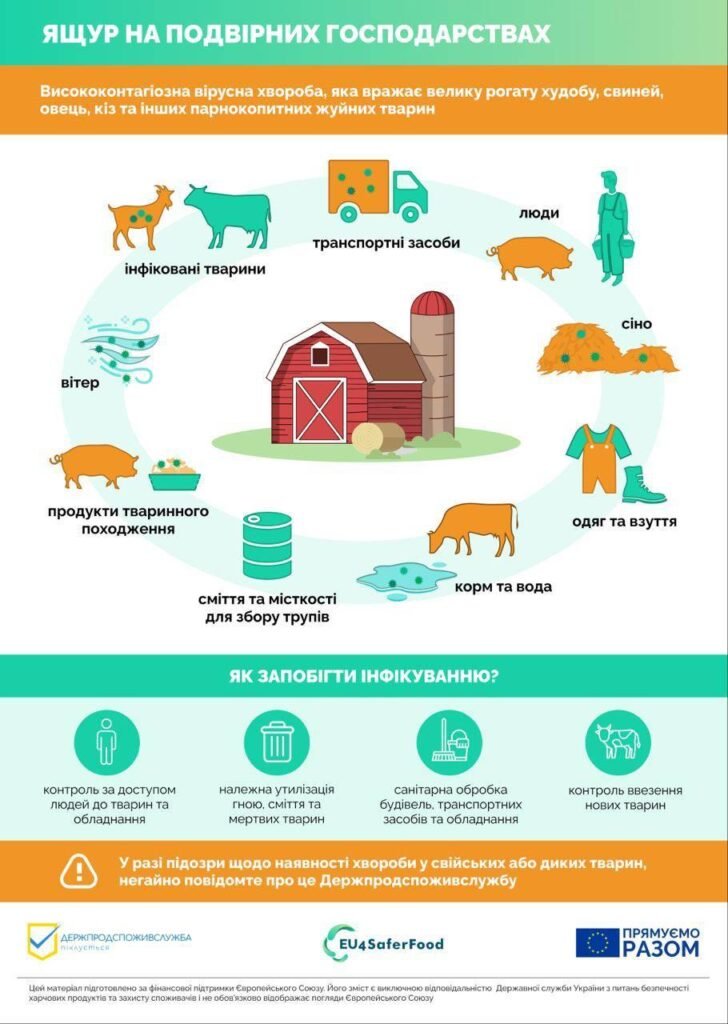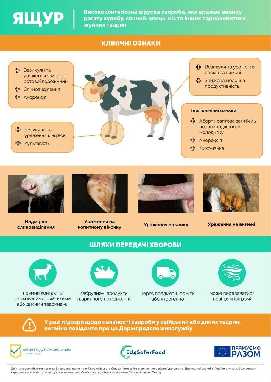 ІНФОРМУЄМО: 1. про необхідність безумовного дотримання умов біобезпеки, закритого режиму роботи та виконання вимог Інструкції щодо профілактики та ліквідації захворювання тварин на ящур, затвердженої наказом Міністерства аграрної політики та продовольства України від 07.08.2017 № 431, зареєстрованої в Міністерстві юстиції України 05 вересня 2017 р. за № 1087/30955, та рішень місцевих державних надзвичайних протиепізоотичних комісій всіх рівнів з питань профілактики ящуру; 2. при виникненні підозри захворювання тварин на ящур негайно інформувати відповідне управління безпечності харчових продуктів та ветеринарної медицини, державного нагляду за дотриманням санітарного законодавства Білоцерківського, Бориспільського, Броварського, Бучанського, Вишгородського, Обухівського та Фастівського районів Головного управління Держпродспоживслужби в Київській області або Київську обласну державну лікарню ветеринарної медицини, Державну лікарню ветеринарної медицини в Обухівському районі, Бориспільську, Бучанську, Броварську, Вишгородську, Фастівську районні та Білоцерківську міську державні лікарні ветеринарної медицини.
